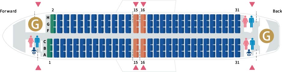 Seat pitch refers to the distance between seat rows. The seat pitch on Skymark aircraft is approximately 31 inches (about 79cm).