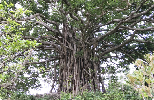 幹や枝が大きく広がり、気根が幾重にも伸びる姿は圧巻で、その迫力ある姿は、島の守り神のような堂々としたたたずまい。写真撮影スポットとしても人気です。