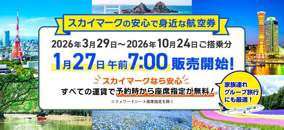 スカイマークは、2026年夏ダイヤ(2026年3月29日(日)~2026年10月24日(土))における各路線の定期便数と各種運賃を決定、1月27日(火)午前7:00より販売を開始します。