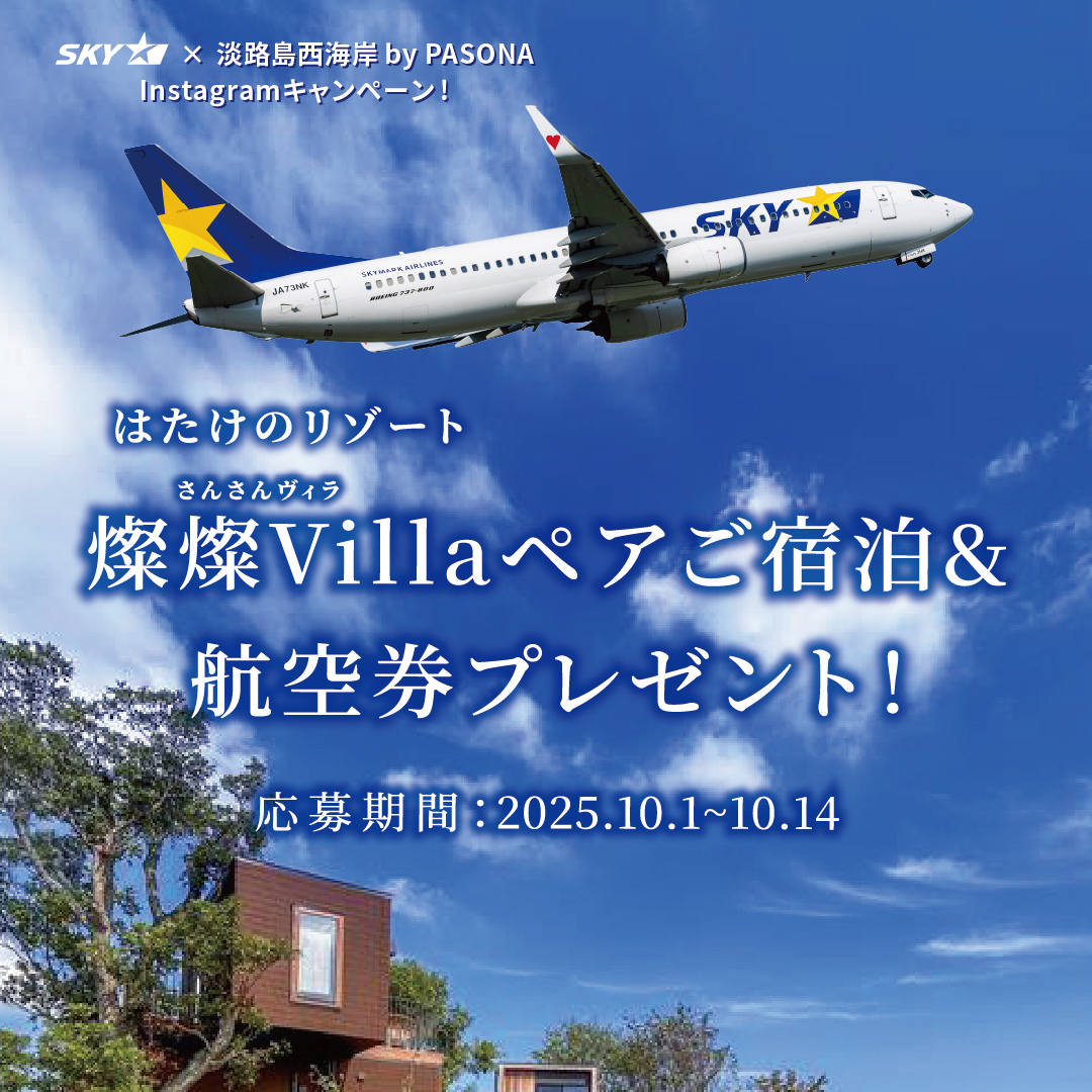 スカイマークは、神戸空港を利用した淡路島の観光促進を目的として、新しくオープンした宿泊施設「はたけのリゾート 燦燦Villa」と共に、「スカイマーク×淡路島西海岸 by PASONA 航空券&宿泊券が当たるキャンペーン」を実施します。