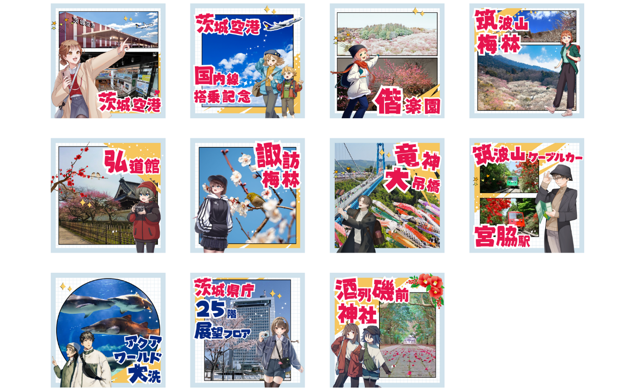 茨城県内の観光地を中心とした対象施設スポットでは、株式会社代々木アニメーション学院イラスト科の学生様が制作したイラストを含むデジタルスタンプを取得できます。