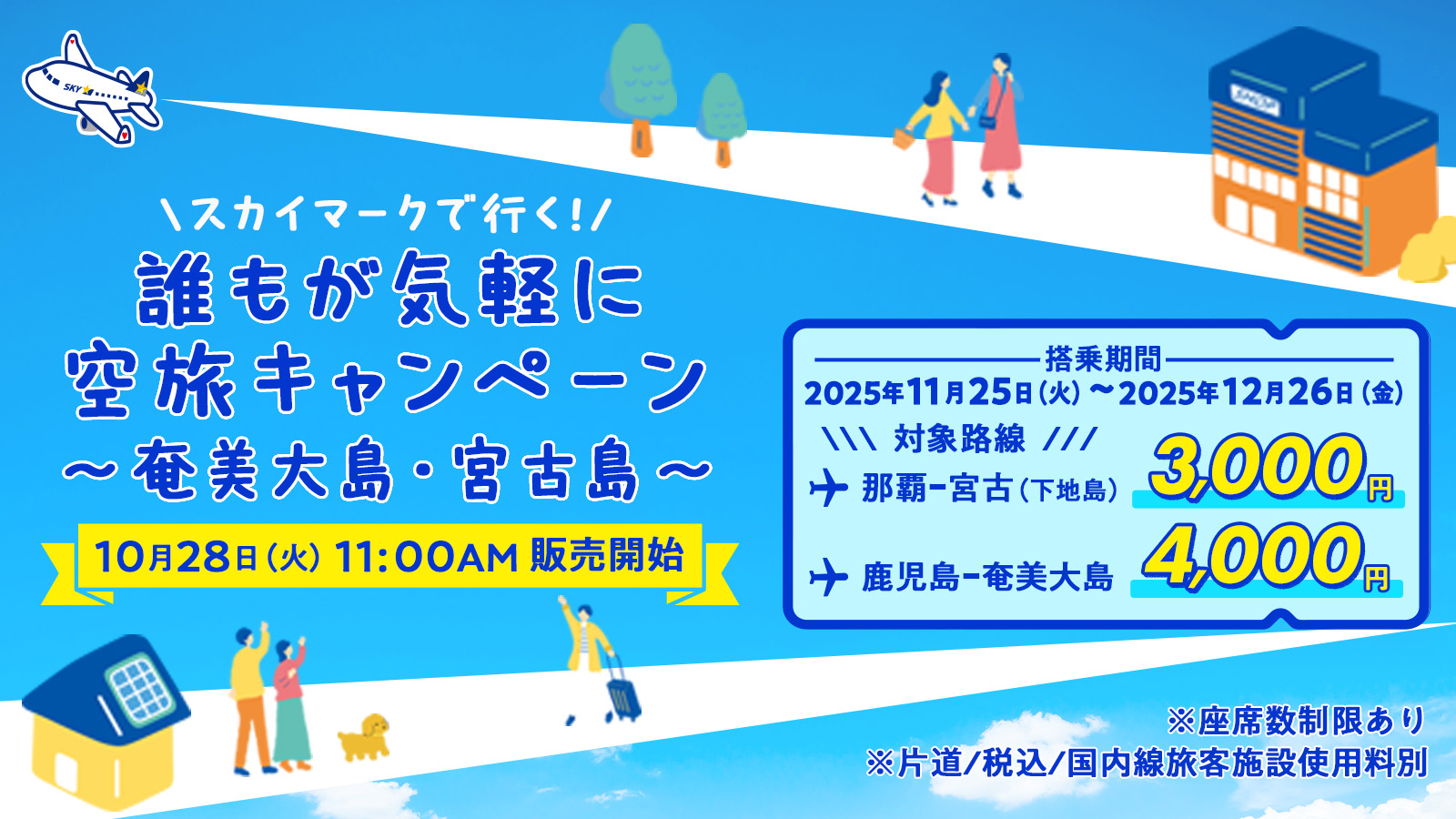 スカイマークは、鹿児島=奄美大島、那覇=宮古(下地島)線を対象に、「誰もが気軽に空旅キャンペーン~奄美大島・宮古島~」を実施、10月28日(火)11:00より販売いたします。